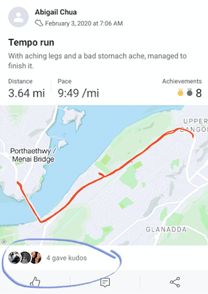 Also, its also a good thing to reward yourself once in a while when you do something (like running 14km on a Saturday morning when you can be asleep). Food is a good motivator for me; I like to have a nice bowl of Spicy Korean Noodles with some dim sum and eggs for breakfast once I finish my run. Its also nice to have people giving ‘kudos’ on your Strava whenever you do a run; it makes you feel good (especially one where you had a bad stomachache and thought you were seriously going to spill your guts on the road).